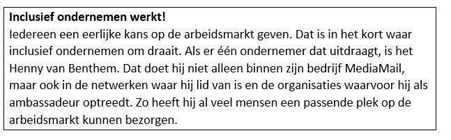 Henny van Benthem, directeur-eigenaar van MediaMail, maakt de ‘jongens’ dagelijks mee: “Ik ben heel tevreden over ze. Ze zijn allebei erg taakgericht, maar gaan er steeds meer dingen naast doen. Allebei zijn ze daarin zo gegroeid! Waar ik rekening mee houd, is dat ze allebei behoefte hebben aan duidelijke instructies en taakafbakening. Soms moet dat wat vaker herhaald worden, maar ook daarin maken ze een mooie ontwikkeling door. Sterker nog, als ze iets onder de knie hebben, gaan ze als een speer. En ze brengen veel gezelligheid en saamhorigheid in ons bedrijf. Als er iets af moet, staan ze gelijk klaar!”