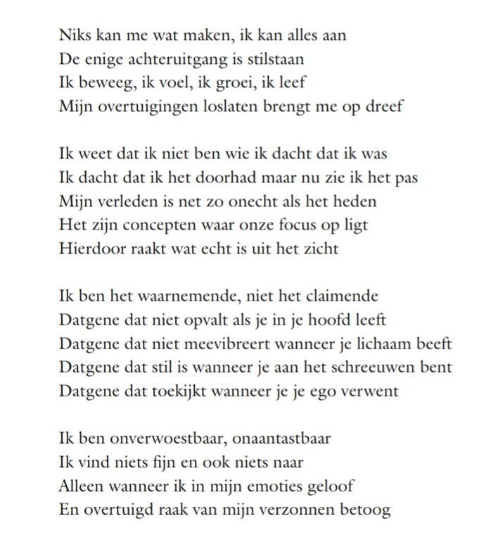 “Langzaamaan krijg ik meer grip op mijn leven. Ik heb een dichtbundel uitgebracht, ben opgeleid tot ervaringsdeskundige en doe vrijwilligerswerk. De dichtbundel, ‘Soul Survival’, gaat over mijn traumaverwerking. Schrijven en dichten helpt mij daarbij. Ik hoop dat ik op mijn beurt ook weer mensen verder kan helpen.”